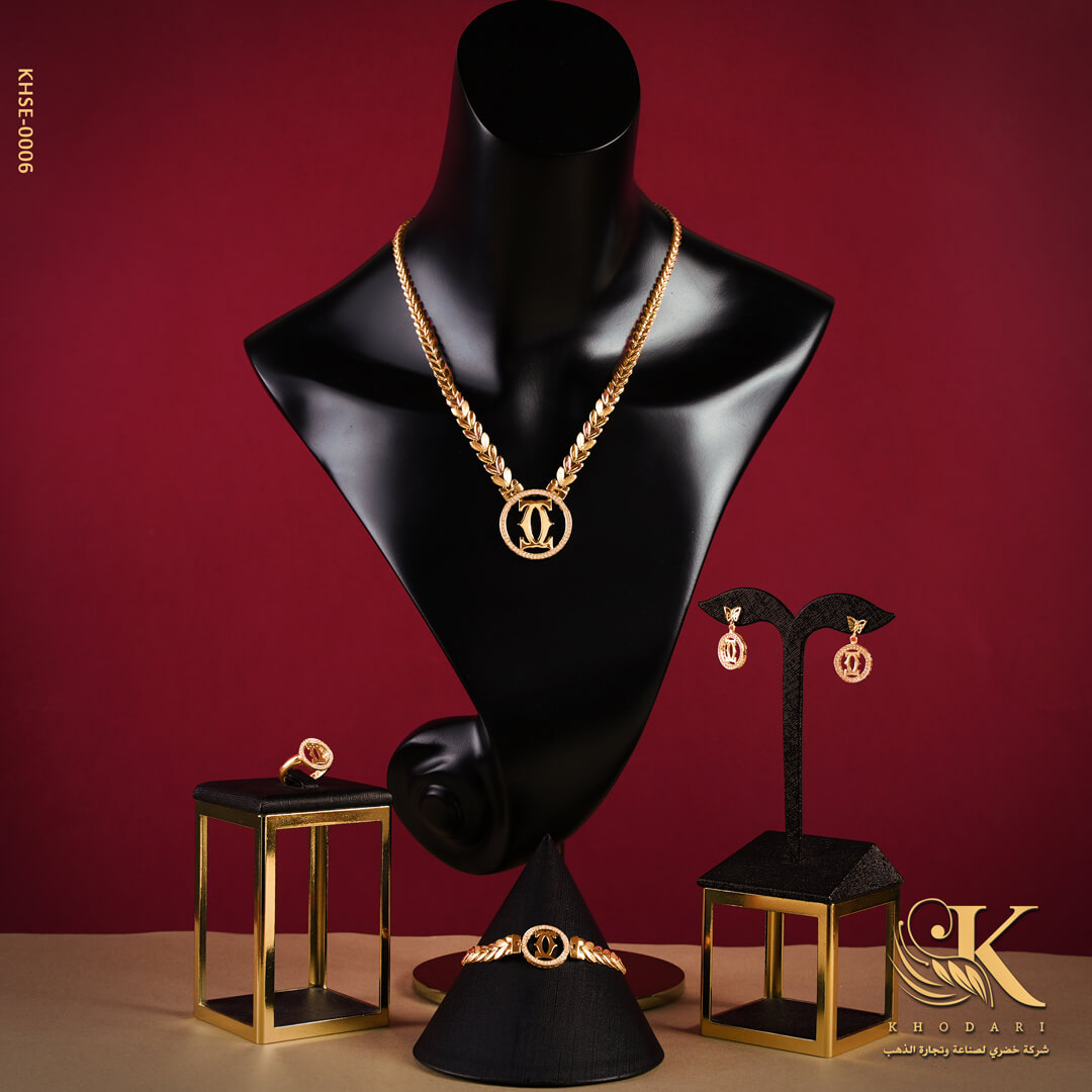 طقم ذهب يتكون من عقد وأقراط وخاتم، مصنوع من الذهب الخالص عيار 21 تصميم فريد وأنيق يناسب جميع المناسبات